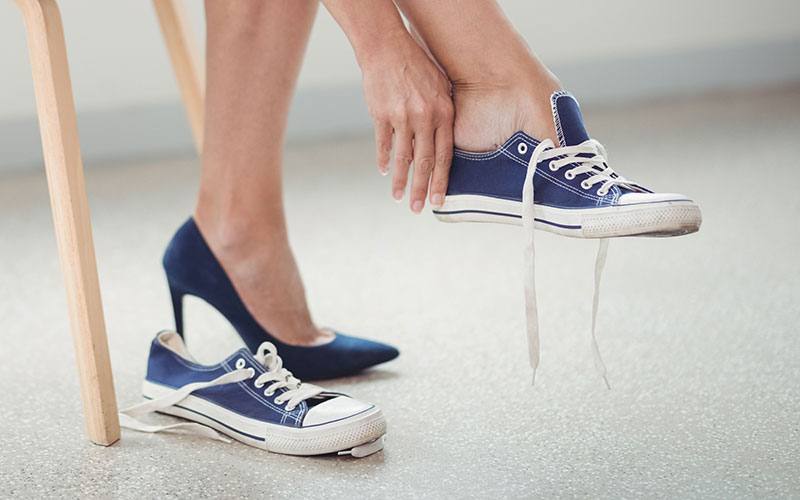 Don't ever go onsite with new shoes. It's also worth remembering that women who usually wear high heels could find that wearing flat shoes all day will cause them real discomfort because the muscles and ligaments at the backs of their legs will be stretched much more than usual.