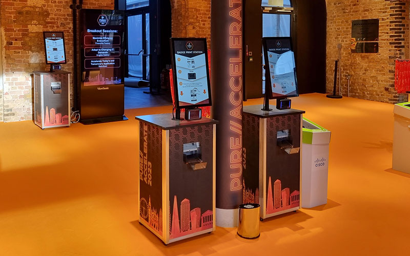 You can opt for individual printing stations that print a badge on demand when presented with a barcode. Our PrintPods are exactly as described; individual pods with an integrated printer that simply and quickly print a badge when a barcode is scanned. These pods are fast, easy to use and eliminate the queues often associated with one point of registration and a bank of printers. Having the barcode scanner and printer in one place makes it so much faster for your delegate to pick up their badge and move into the event, and individual stations remove the potential confusion caused by a delegate picking up the wrong badge. Print on demand badges reduce paper waste and are a big step towards achieving your event sustainability goals.